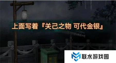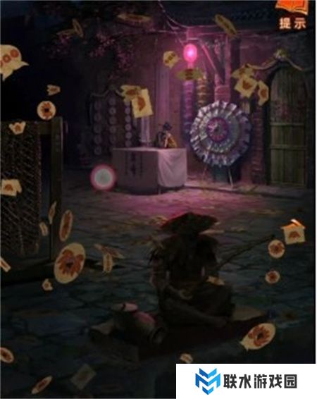 接着观察天上飘舞的纸钱,共有四种款式,分别是:圆形纸钱上绘有莲花,桃形纸钱上画有三个圈,方形纸钱上绘制元宝,而元宝形纸钱上则有桃子图案。将这些图案记住后,转向左侧的铜渔网,观察到柱子上的图案与纸钱相符,调整后获得铜渔网。