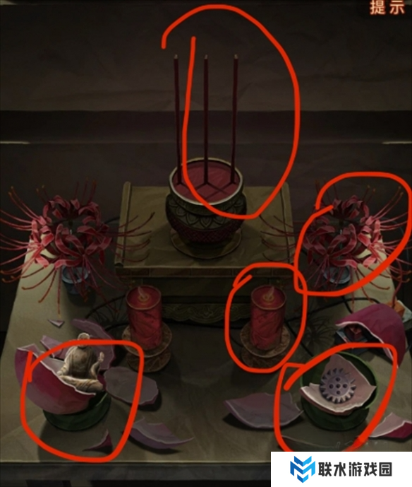 翻看书,查看谚语,根据线索将手串放在供桌处,获得【经文】。墙上的花圈排列形状是关键线索。