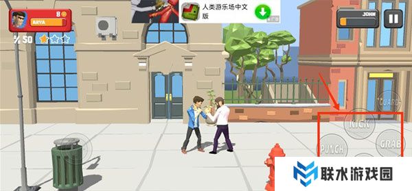 6. 当敌人出现时,可以通过点击右侧的攻击、踢、跳跃和抓取按钮进行攻击或躲避。