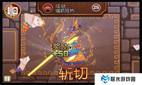 3. 游戏进行时,玩家需要滑动屏幕来切掉从上方掉落的水果。