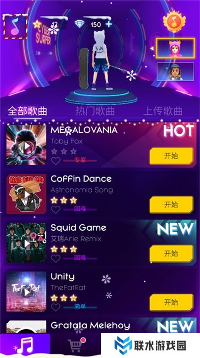 7、返回主页面,选择“全部歌曲”、“热门歌曲”或“上传歌曲”,自由挑选最爱的旋律进行挑战。