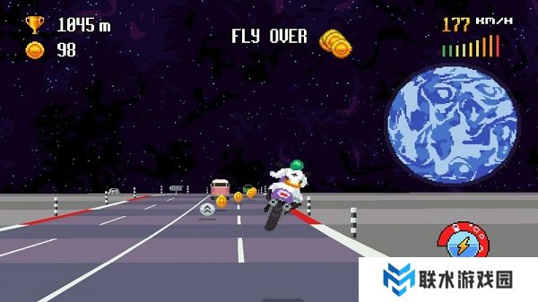 在游戏中,玩家需要操控摩托车左右移动,通过擦车、收集金币、跳跃板等方式来获得分数。