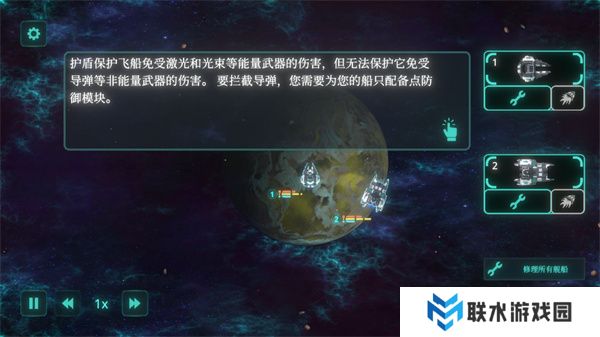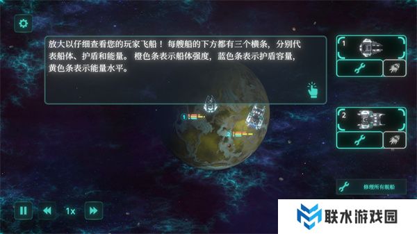 3. 每艘飞船下方有三个横条,分别显示船体、护盾和能量的状态。