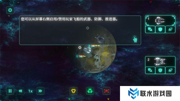 8. 你还可以在屏幕右侧启用或禁用飞船的武器、防御系统和推进器。
