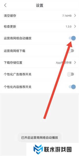 4、进入设置页面后,找到【运营商网络自动播放】选项,并将其开关打开即可完成设置。