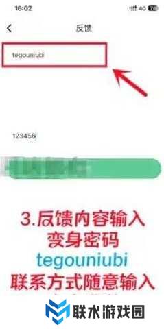 2、反馈内容输入变身密码“tegouyyds”,联系方式随意输入,点击发送。