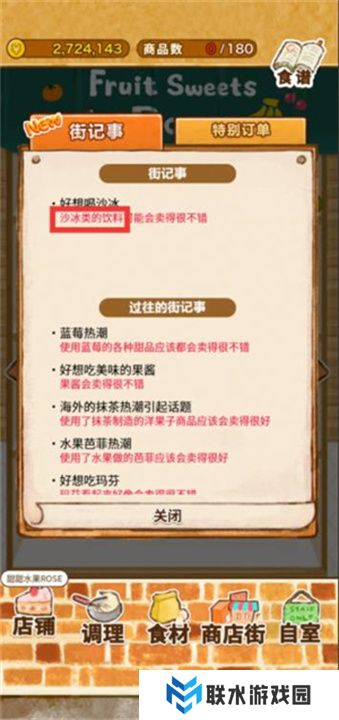 -游戏中有个很关键的功能——街记事。它不仅能提供当前流行的甜点信息,还能帮助你及时掌握市场动态,提升利润!记得在还清3000000债务后,解锁水果店和食店,开启新的盈利路径哦。