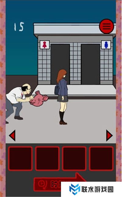 这关比较有挑战性,也是有多种解法的。游戏提供了两个猪头,一个给妹子,另一个给痴汉。先把一个猪头放在妹子和女厕所之间,再把另一个猪头放在男厕所前给痴汉。重要的是,给妹子的猪头不能放得太早,最好在第1或第2回合内让她吃,否则她会因吃腐烂的猪头而死亡。接着,痴汉吃猪头进入厕所,妹子走几步后开始呕吐。痴汉出来后,妹子吐完继续前行。痴汉吃妹子的部分画面有点难以描述,但妹子最后成功回家。