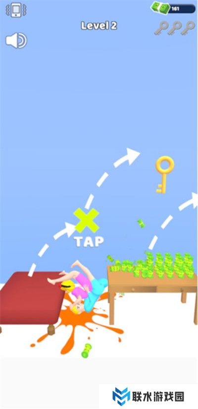 1、玩家通过轻轻点击屏幕,控制情侣在空中不断翻转前进。而且情侣的头部不能触地,否则游戏就会失败。