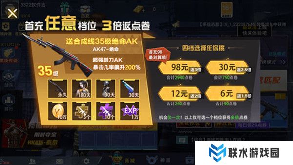首次充值不仅能获得双倍点券,还有机会获得独特的绝版武器。
