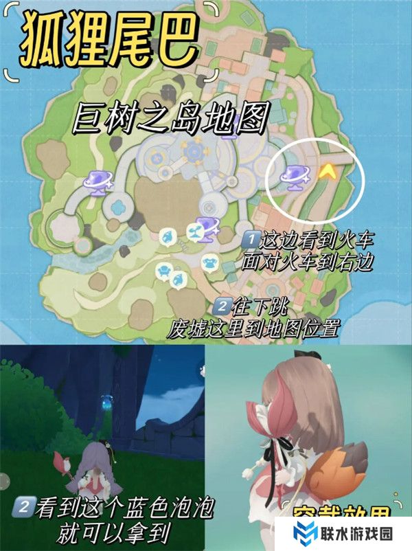 狐狸尾巴可能不是很多人都知道。首先找到地图上的火车标记,站在火车前面朝右走,走到尽头后跳下来,直奔废墟。然后跟着地图指引走,你就能收获这个超级可爱的狐狸尾巴啦。