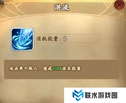 普通技能 - 洪流:消耗0能量,对单个敌人造成158%的法术伤害。