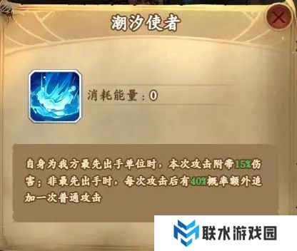 刻印技能 - 潮汐使者:当船长为我方首个出手单位时,本次攻击附带15%额外伤害;若非首个出手,则每次攻击后有40%概率进行一次追加普通攻击。刻印技能将在开服20天后激活。