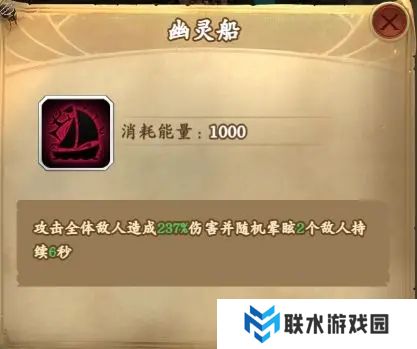 专属技能 - 幽灵船:消耗1000能量,对全体敌人造成237%的伤害,并随机眩晕2个敌人,持续6秒。