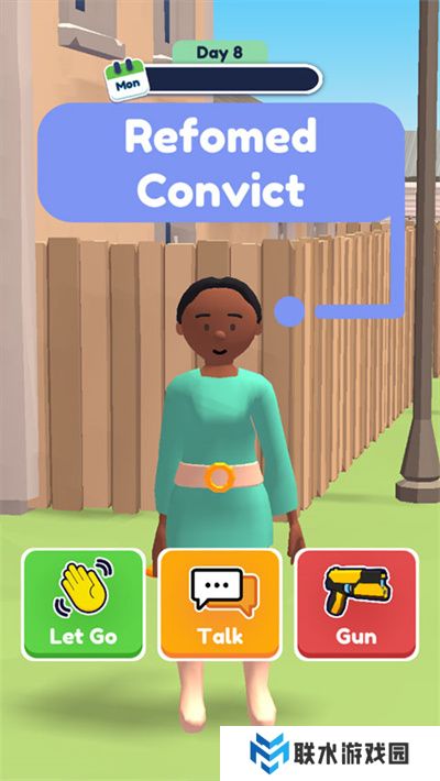 4. 当锁定目标后,你可以与他们对话。如果他们没有违法,可以点击“let go”让其离开;如果不确定,可以选择“talk”进行交流确认其身份。若确认是罪犯,可以点击“gun”进行逮捕。