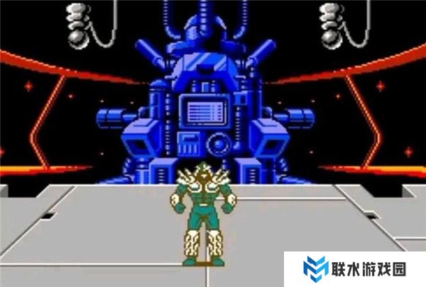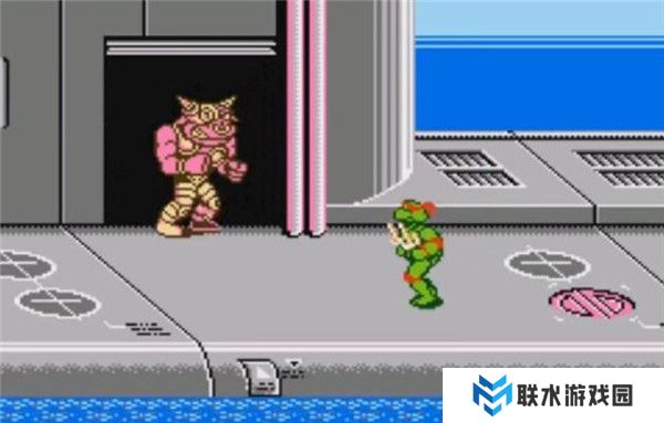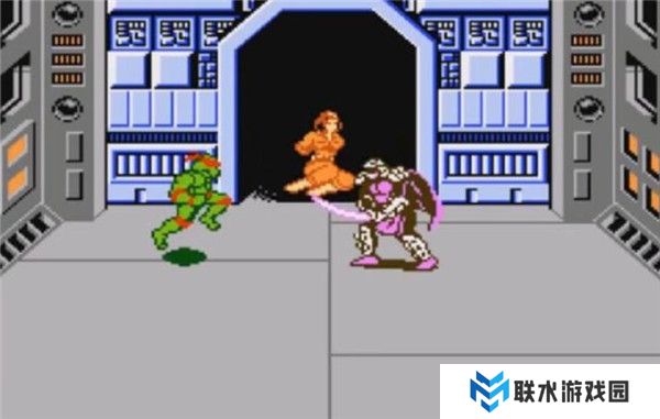 场景描述:神龟们进入克朗的飞船后,克朗操控机器人迎战。他的机器人拥有强大的飞弹和电击能力,给神龟们带来不少麻烦。