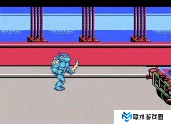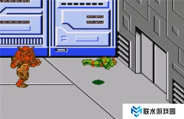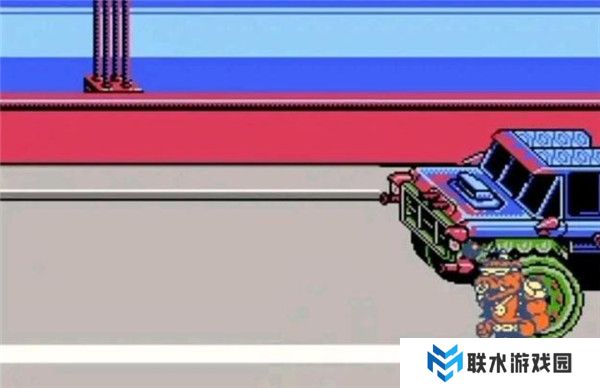 场景描述:神龟们在潜艇内闯过重重障碍后,进入跨海大桥时,遭遇了由比伯驾驶的卡车,车上的坏龟斯拉什突然跳出,拦住了他们的去路。