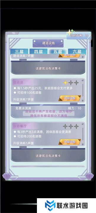 刚开始时,优先解锁五层的甜品店,P6的决策卡非常实用,可以长时间带来好处。随后可以考虑开设四到六层的一些设施,比如:
