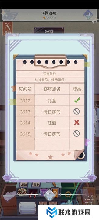 游戏刚开始时,你会接触到客房服务和赠品的管理。这两者其实是分开的,所以你得小心。客房服务只需要按照要求摆放礼盒、鲜花或者红酒,其他的就不必放。特别是鲜花旁边的那一件物品,通常是赠品,只有在标记了【✓】之后才能放。所以记得不要在没有打钩的时候就把赠品放进去。