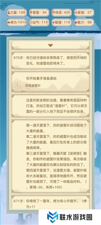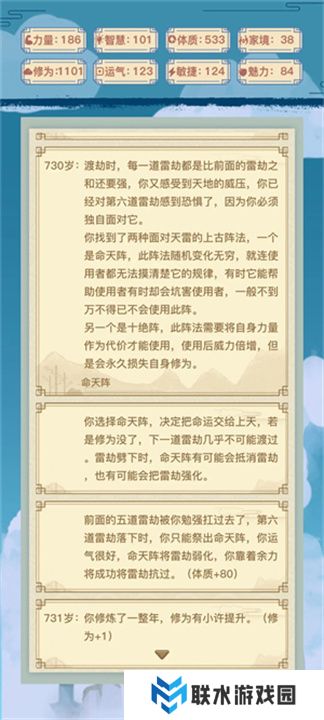 渡劫过程是整个游戏的高难度挑战。为了顺利渡劫,你需要确保第一道劫难能够通过。选择平原或山顶,体质较高的玩家可以选择山顶。第二道海底劫难无法通过,选择山洞即可。第三道需要建阵法来通过。第四道会根据家境做判定,若有发明家天赋,家境只需30即可通过,否则需要80。第五道是敏捷与魅力的考验,敏捷100可以成功远离宗门,魅力100则能保护弟子。第六道则是运气的考量,运气达到100以上可以选择“命天阵”安全突破,否则你将面临属性全减40的惩罚,后续修炼地点也会发生变化。第七道是天劫的四人围攻,若力量超过150,可以协助白洛竹消灭敌人,否则白洛竹将遭遇厄运。第八道天劫的修为限制从1000提升至1400,这要求玩家必须保持良好的修炼进度。