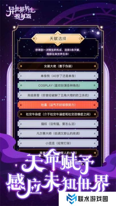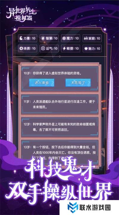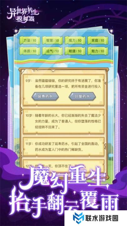 异世界转生模拟器是一款充满奇幻与冒险的文字模拟游戏。在这里,你将化身为不同角色,穿梭于各式各样的异世界,体验全新的人生。每个世界都有独特的故事和设定,等待你去探索与选择。你的决定将引导剧情的走向,塑造出专属于你的冒险轨迹。无论是成为强大的魔法师,还是英勇的骑士,亦或是神秘的召唤师,每一次转生都将带来不一样的挑战与机遇。快来体验无尽的可能性,在异世界中开启属于你的传奇旅程吧!