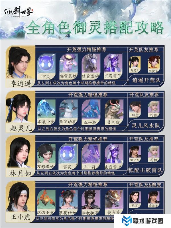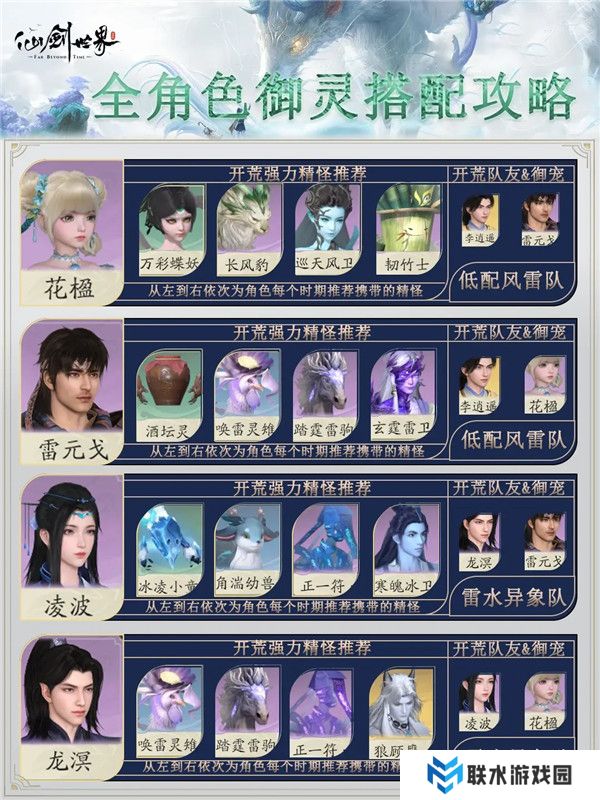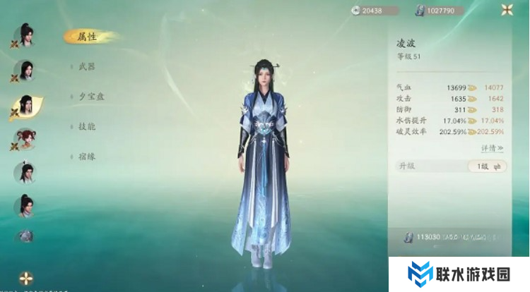 凌波专精水系伤害和破灵输出。开场时通过E和Q技能触发破灵伤害,然后切换回林月如打出高爆发连击。凌波的套装选择较为自由,但效果一般。早期装备有啥用啥即可,50级中期可以堆积水系伤害(如云川套或碧虚套),或选择玄冥套与破锋套来强化破灵效果。