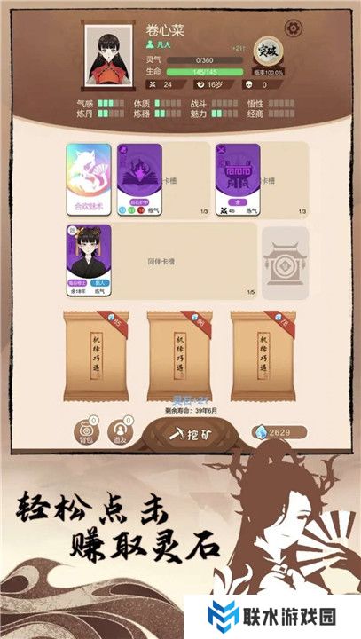 1、下载安装并进入游戏后,点击【挖矿】按钮,自动获取资源,同时消耗时间寿元。