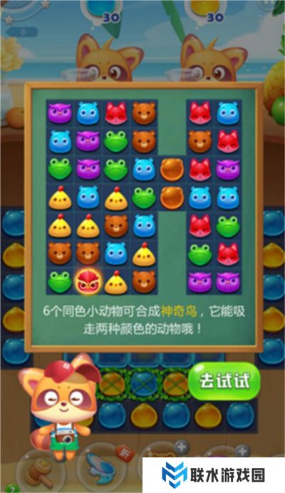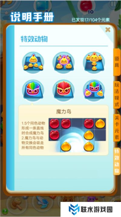 1. 当5个同色动物排列成一条直线时,将激活魔力鸟特效。