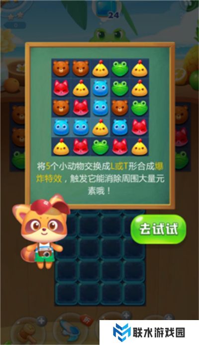 1. 当5个同色动物形成T型或L型排列时,将激活爆炸特效。