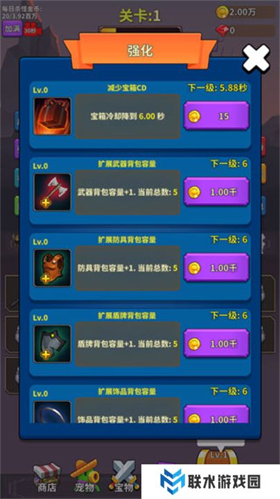 4、点击强化选项,增强宝箱的冷却时间和背包容量,提升游戏效率。