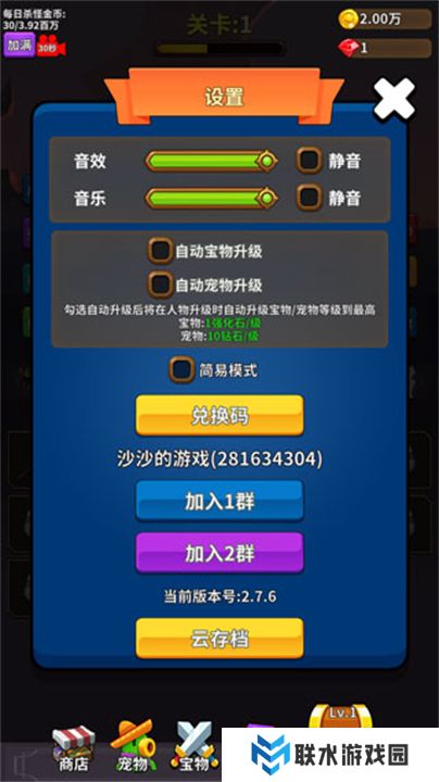 7、点击设置可调整自动宝物和宠物的升级选项,并进行云存档,确保数据安全。