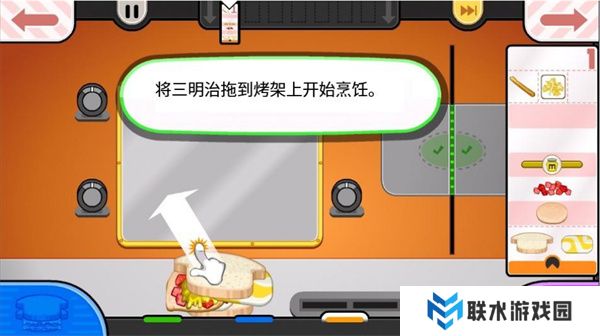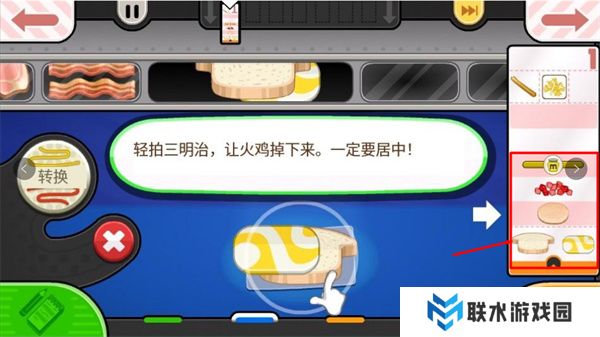 7. 屏幕右侧是制作三明治的食材,轻拍食材,它们会掉下来。记得要把它们放在中央,不然三明治看起来不太好看哦!(小编自己也犯过这个错误!)