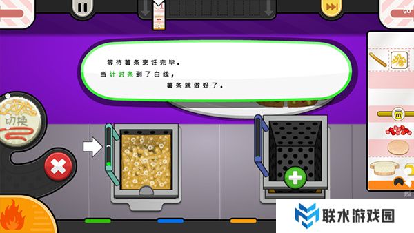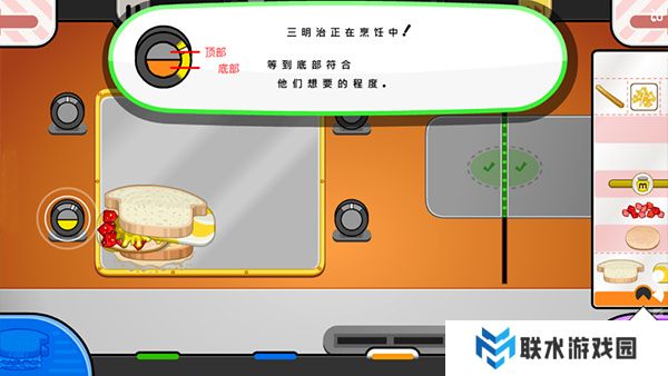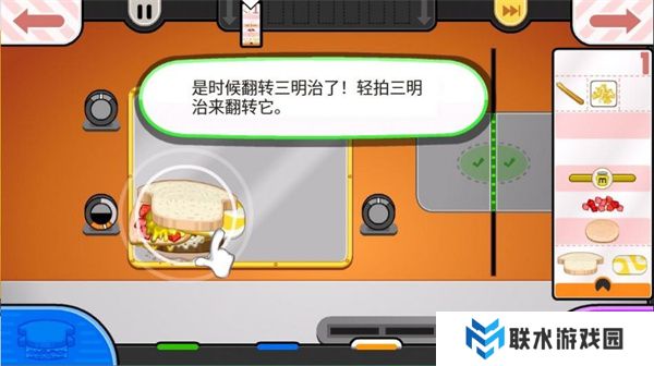 9. 在烹饪过程中,如果三明治左边的计时器显示红色警告,就要轻拍三明治翻转它。完成后,把三明治拖到右边打勾的位置,交给顾客萨沙就可以了!