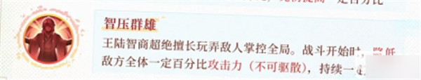 王陆不仅体力强悍,智谋也十分出众。在战斗初期,他会通过自身的智慧降低敌方全体攻击力,效果不可驱散,并持续一段时间。而当王陆不幸阵亡时,他将以一定血量复活,并激活【运筹帷幄】状态,进一步加强自己对战局的掌控。这个技能每场战斗都会触发一次,帮助王陆保持强大的续航能力。