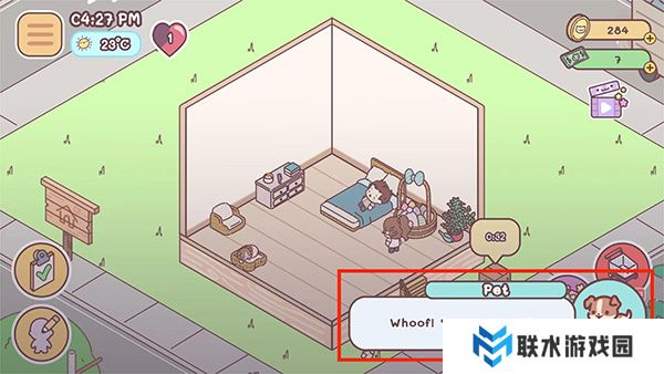 4、返回游戏主界面,点击屏幕上的宠物图标,此时右下角将会出现宠物的互动对话框,完成与宠物的问候。