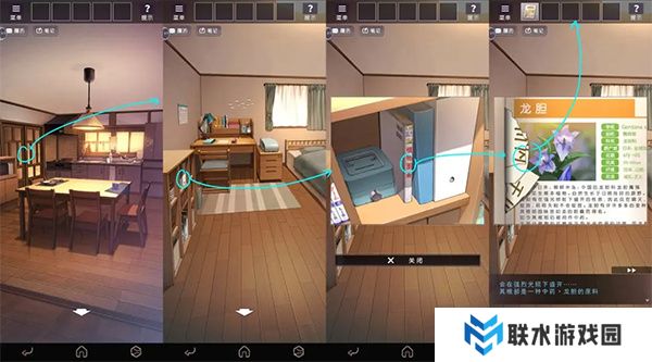 回到家后,通过微波炉旁边的门进入卧室,从书架上拿到植物图鉴,翻到龙胆一页,获得碎片。