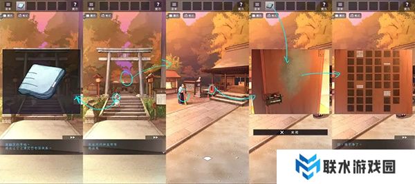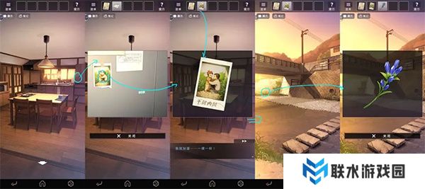 返回客厅,从冰箱门上取得照片,将碎片与照片拼合,解锁川内川场景(神社左侧)。在对岸地面上找到龙胆花。