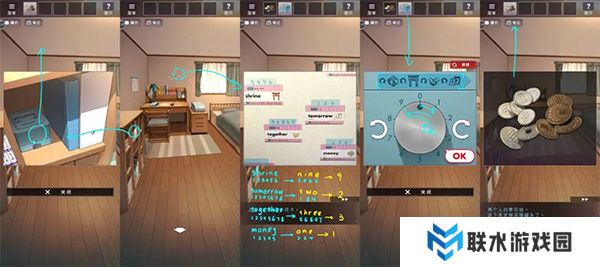 回家后,从书架上找到存钱罐,依据墙上的单词提示打开存钱罐,拿到零钱。