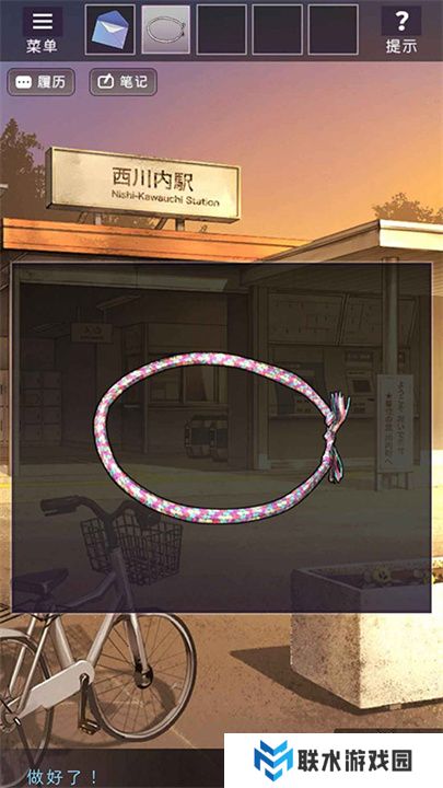 在街道上的自动售货机处获取绳子,将绳子和木棍组合。回到水管处,拿到破损的包装袋。