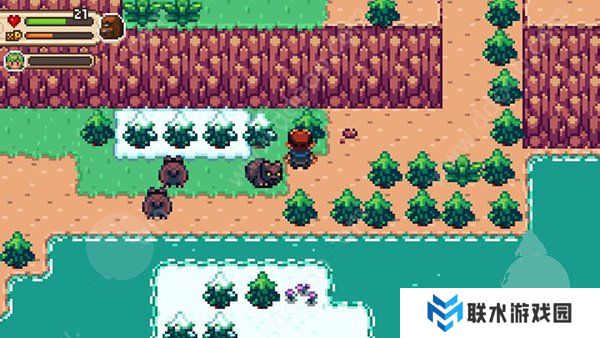 6.在没有武器时,灌木丛会挡住去路,获得武器后可以通过点击攻击键击毁灌木丛,这样可以获得补血的红心和金币。屏幕左上角的绿色条表示生命值,底下的黄色条表示经验值,击杀怪物可获得经验并升级。