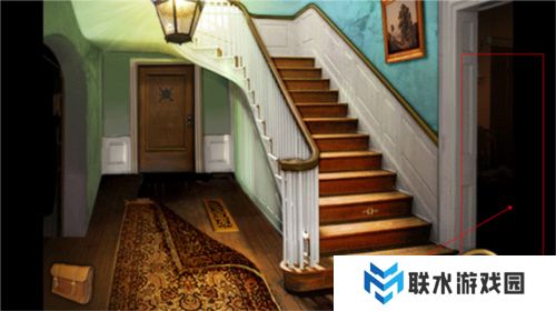 4.进入大门然后进入到大厅可以看到一个楼梯房间,注意底下的地毯、楼梯墙壁的壁画、楼梯上的钥匙孔以及对面的一扇门。