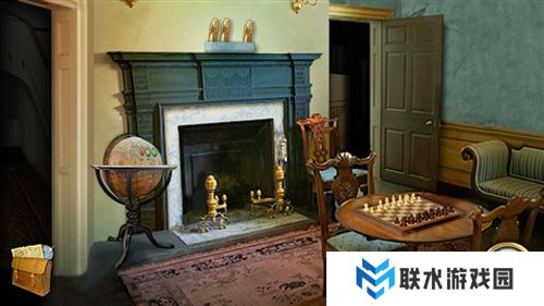 15.下楼回到一楼,在楼梯右边还有一个房间,点击进去可以看到一个带壁炉的客厅,注意棋盘、地球仪、壁炉和壁炉上的鸟。
