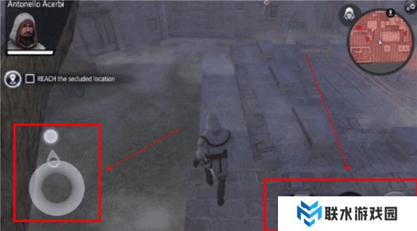 玩家可以选择两种控制方式。一种是像PC上那样的点击行走模式,另一种则是手游常用的双摇杆操作。为了适应手机的特点攀爬、跳跃和翻越等动作都被简化,只需靠近障碍物角色就会自动完成这些动作,至于刺杀敌人则只需点击目标上方的骷髅图标就行。