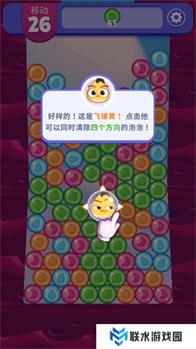 1、打开愤怒的小鸟梦幻爆破,玩家可通过触碰同色气泡实现其湮灭。
