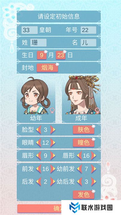 2、设定公主的姓名、生日、封地,调整五官细节,如脸型、眼睛、发色等。