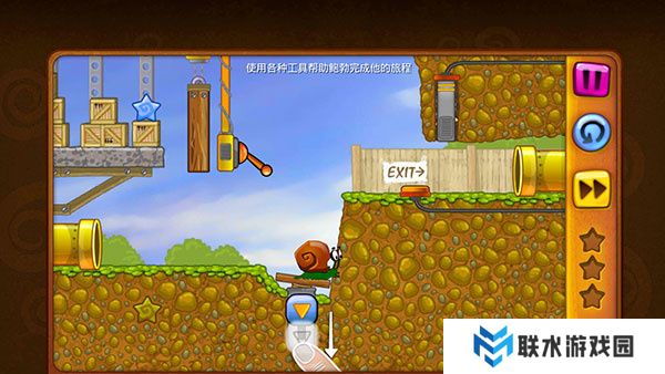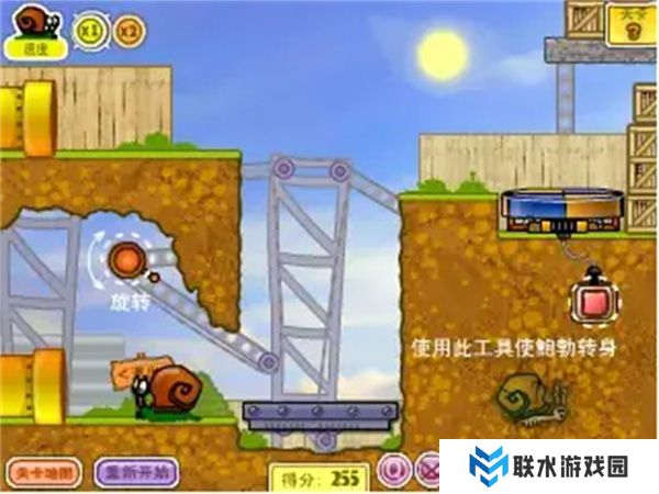 2. 首先点击下方的摇杆,顺时针旋转,直到浮梯升高与右侧地面平行,然后让蜗牛从上方通过。