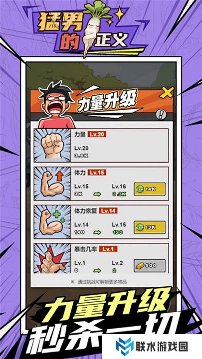 通过力量、体力、暴击率等属性的提升,塑造独一无二的猛男角色。