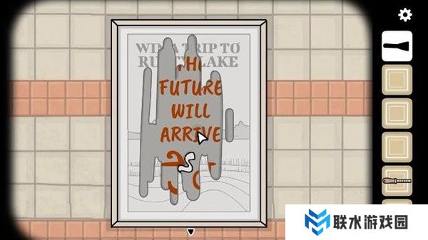 5. 在婴儿车附近有一张海报,拿铲子刮开海报,看到上面写着“THE FUTURE WILL ARRIVE”(未来即将到来),并且海报底部会显现一个神秘符号。
