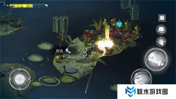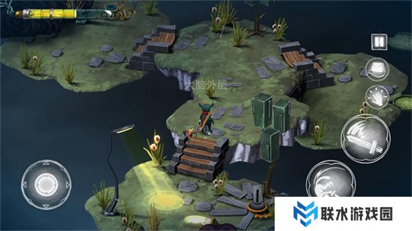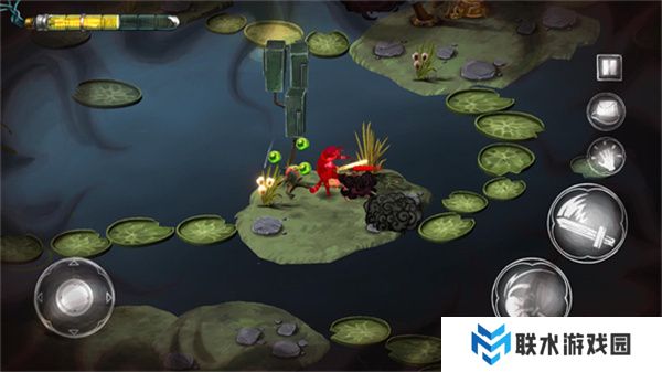 -进入关卡后,左侧的虚拟摇杆控制角色的移动,右侧则是攻击和翻滚按钮。攻击按钮上方还有互动键和背包管理功能,屏幕左上角显示着你的血量,时刻注意保持安全。