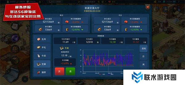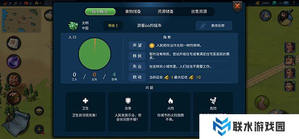 8. 点击左下角的版图按钮,可以查看国家的整体状况,包括城市概况、食物储备、资源储备以及资源的出售等信息。